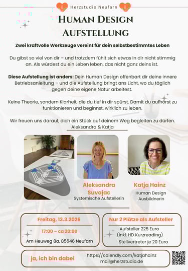 Damit alles gut verinnerlicht werden kann, gibt es eine Aufstellung, um den nötigen Schubs zu bekommen um z.B. mehr in die Sichtbarkeit zu kommen, dein eigenes Potenzial zu erkennen oder auch aus festgefahrene Situationen herauszukommen.